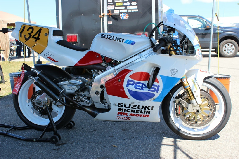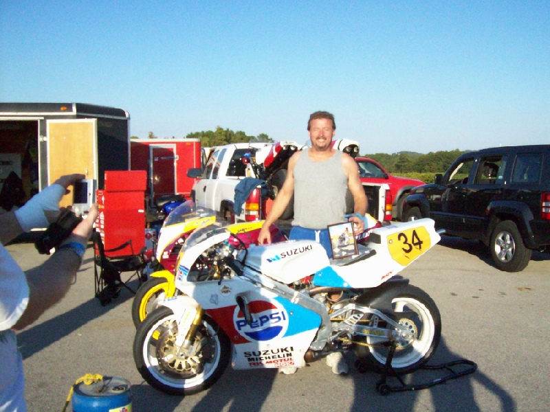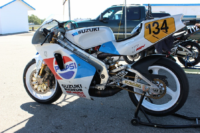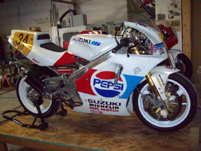 From the moment I first saw the 1988 rgv500 pepsi suzuki I realized we just had to build one. It was the nicest and sexiest bike in the GP paddock. All others were tobacco sponsored but pepsi had the guts to step up to the plate and back a GP team. Our first replica (top picture) was of the 1988 bike. It was the rg500 motor in the rg500 frame, braced arm, '88 gsxr750 front end, and lots of engine work. That bike was sold in the mid '90's to someone in Colorado. Our second replica is of the 1989 bike. The '89 GP bike was far more advanced than the '88 bike and so is ours. The motor is still rg500 based but shoe-horned into a rgv250 chassis with banana arm. Ohlins front and rear suspension, marchesini wheels, brembo brakes, CNC'd adjustable triples, clutch cover, disc covers, and instrument/fairing brackets. The motor is also more advanced; nova gearbox, programmable ignition, custom exhaust, and TMX35 carbs to name a few. How does it work you ask?? That is "yours truly" holding the 3rd place trophy from unlimited two stroke GP class during the Barber m/s park AHRMA race weekend / 25th two stroke gathering held October, 2010.